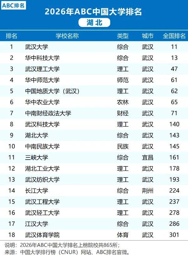 提到湖北的高校, 良多人起首想到的即是武大取华科, 这对耀眼的组合, 这很天然, 两所985院校就正在武汉, 本身就给人一种平稳的感受, 然而看看ABC新出的2026年排名, 环境似乎有些变化。